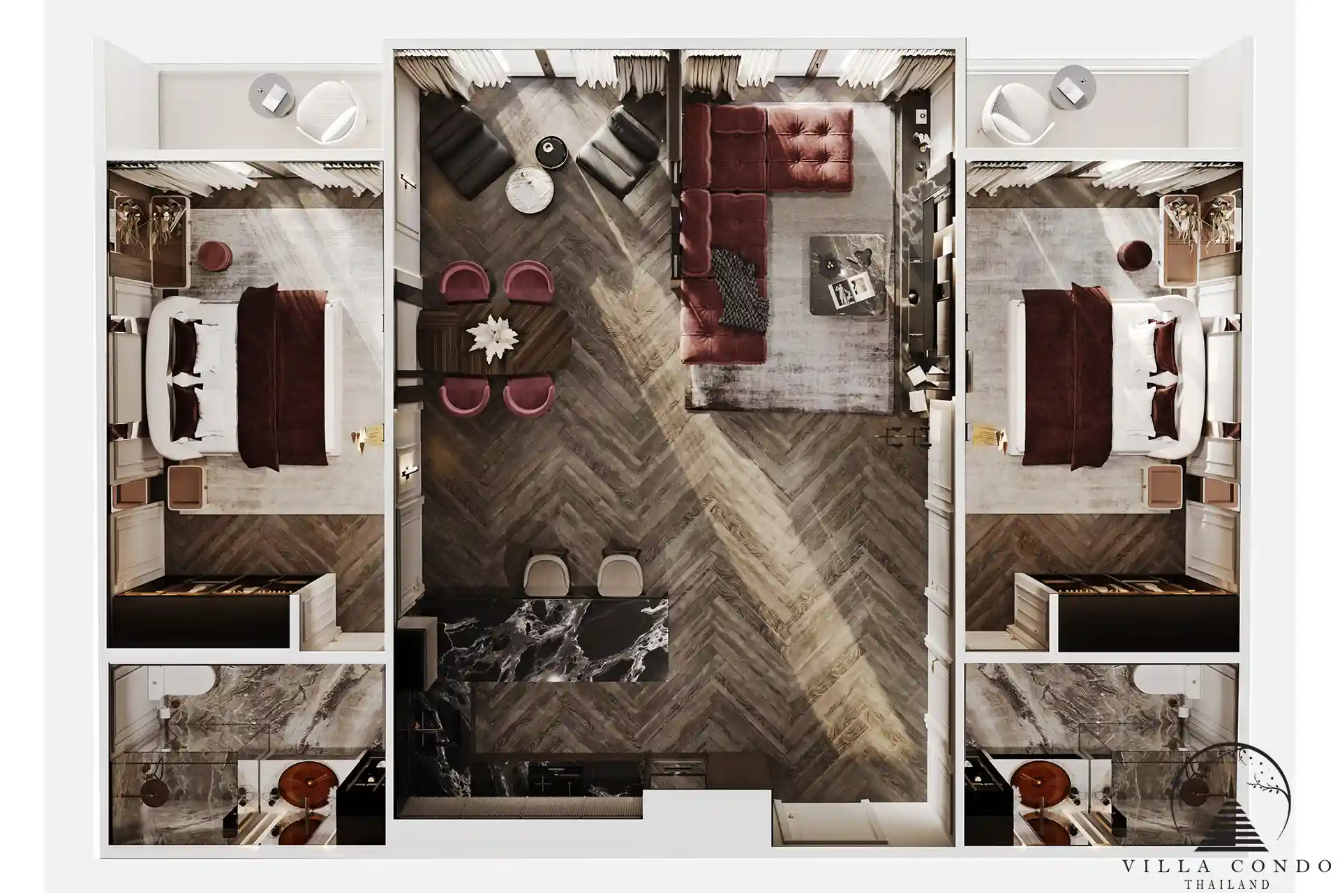 Each unit at Hennessy Residence is a masterpiece of design, characterized by rich colors, bold geometry, and decadent detailing. The interiors reflect the finest elements of art deco, with stylized geometric patterns, luxurious materials, and atmospheric lighting that create a warm and inviting ambiance. Every corner of these residences is crafted to enhance the living experience, offering functional luxury that meets the highest standards of comfort and style.