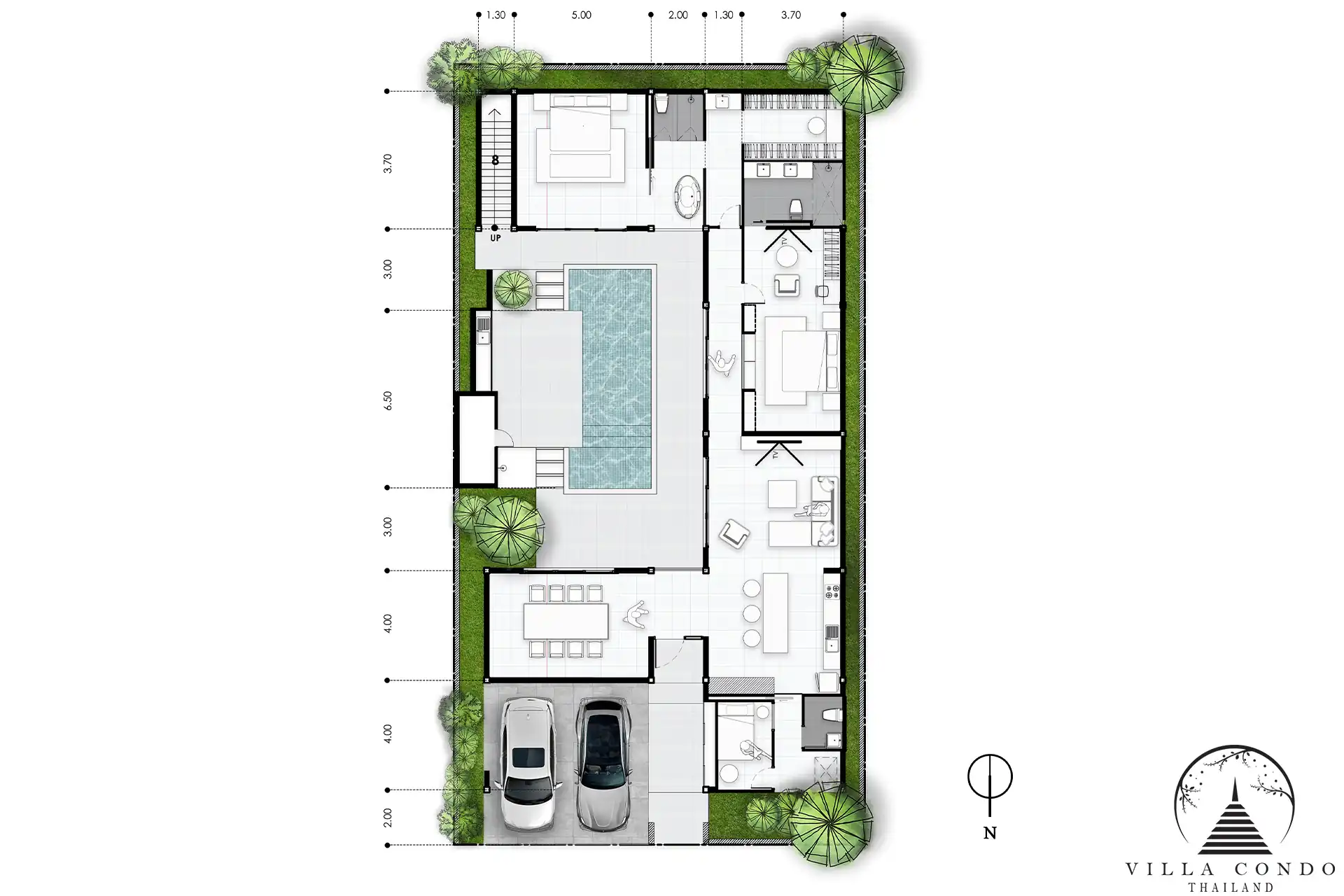 Lay Pearl Villas offer spacious living areas, each covering 428 sqm of land and 416 sqm of built-up area. These two-story villas feature high ceilings in the living and dining rooms, providing a fresh and airy environment. The primary living spaces, including the living room, dining area, and kitchen, are designed to face the pool, offering stunning views and a seamless indoor-outdoor living experience.