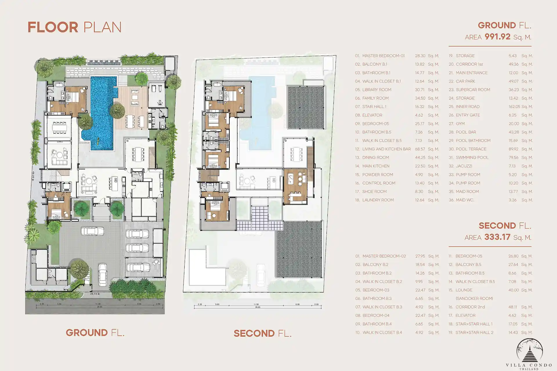 These two-story luxury villas are thoughtfully designed with a modern architectural style, featuring six bedrooms, living rooms, a working room, fully-equipped kitchen, dining room, outdoor pool with a Jacuzzi, a stunning 4-meter waterfall wall, beautifully landscaped gardens, and ample car parking space for both super cars and three additional cars.