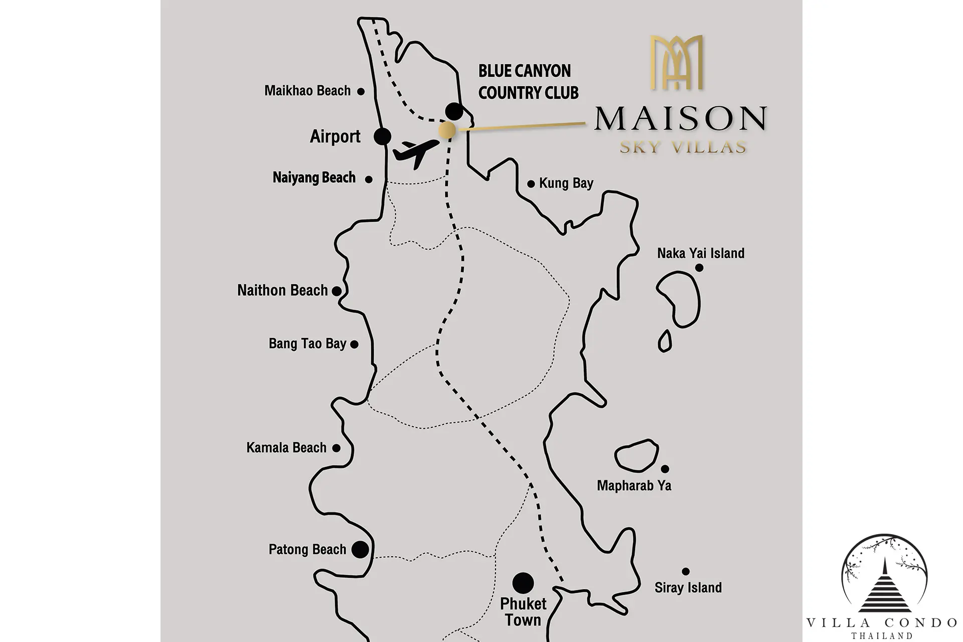 Maison Sky Villas is strategically located to offer residents the best of Phuket’s natural beauty and luxury. Just a short drive from the scenic Naiyang and Maikhao beaches, residents can indulge in the tranquil and serene environment. The proximity to Blue Canyon Country Club and other upscale amenities ensures that residents enjoy a well-connected and vibrant lifestyle.