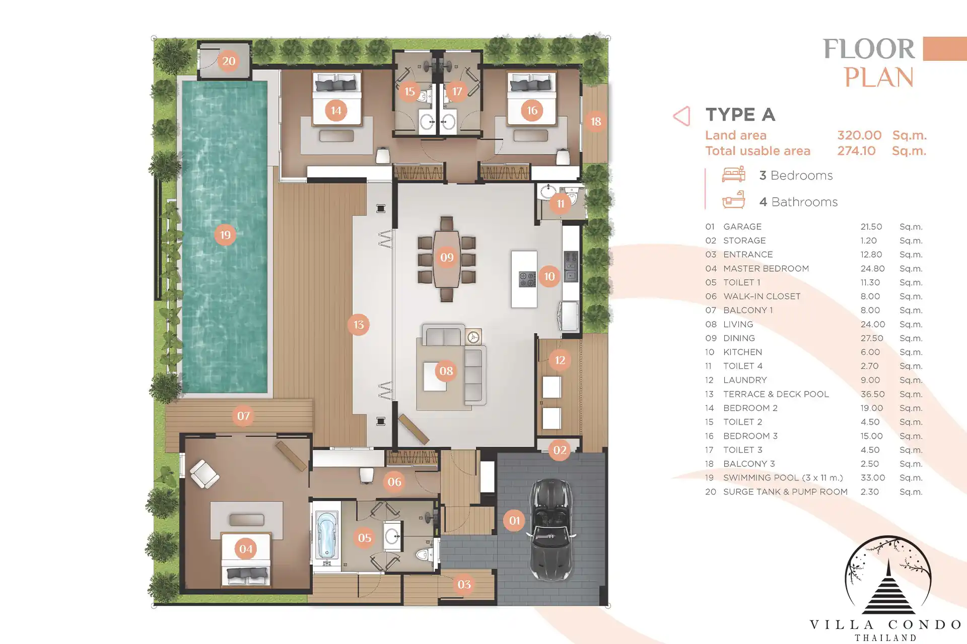 Monetaria Villas offers a range of 3 and 4-bedroom layouts, catering to families of all sizes. The built-up areas range from 274.10 sqm to 374.90 sqm, providing ample space for living and relaxation. Each bedroom is a sanctuary of relaxation, featuring plush furnishings and stunning views of the surrounding landscape. The master suite is particularly impressive, complete with a luxurious en-suite bathroom and a private balcony, offering residents a private retreat within their own home.
