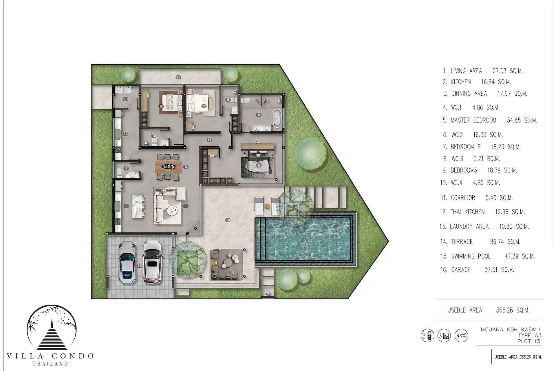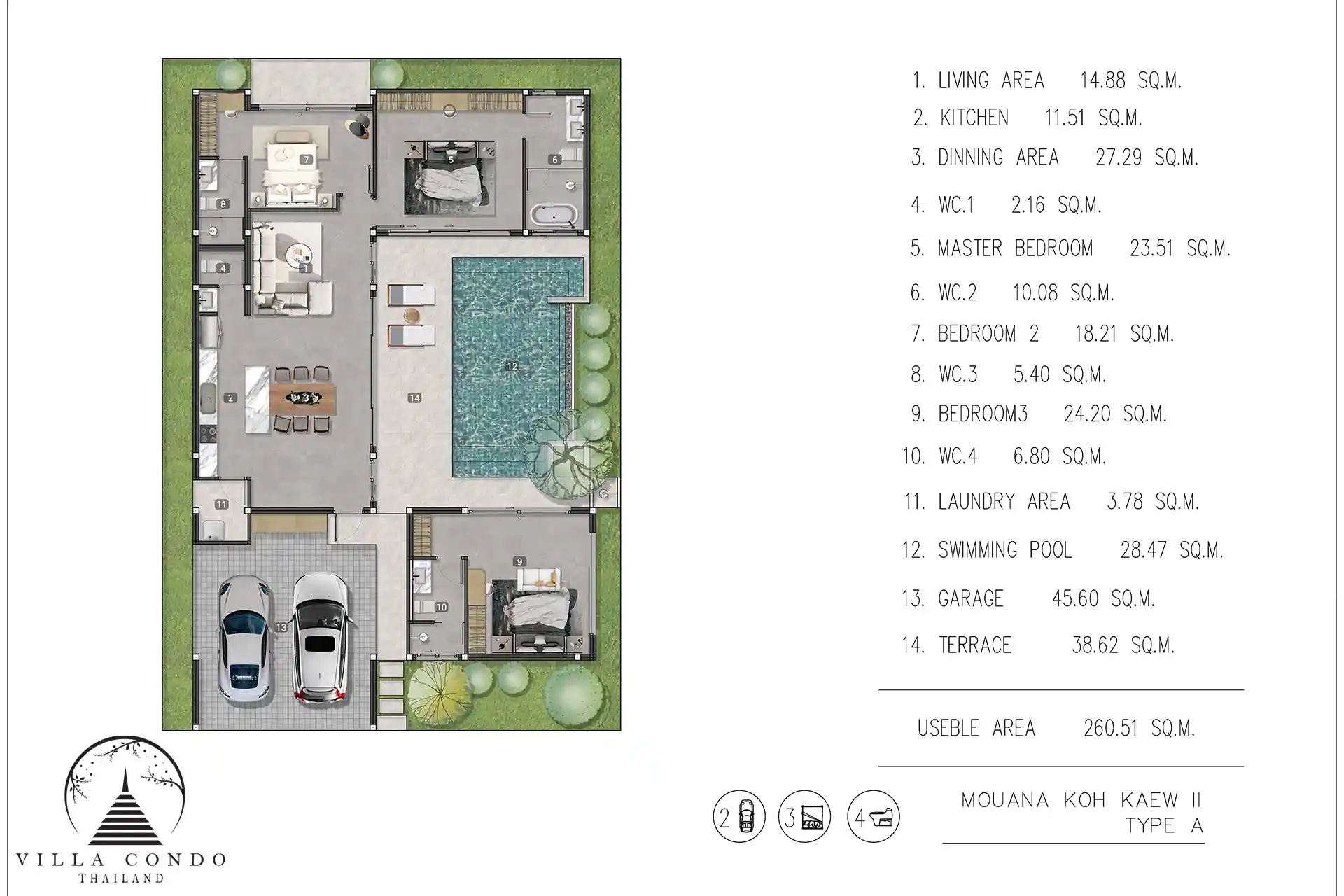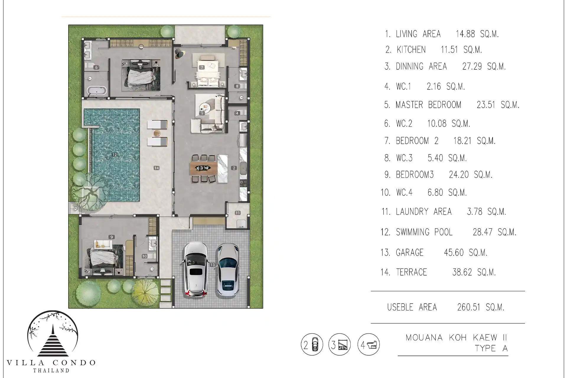 Exceptional Facilities Each villa at Mouana Grande Ko Kaeo comes with a private swimming pool, providing a perfect retreat for relaxation and leisure. The expansive sundeck area invites residents to bask in the island’s abundant sunshine. With dedicated parking spaces for each villa, convenience is ensured. The community is designed with beautiful common areas and manicured gardens that enhance the tropical ambiance, offering spaces where neighbors can connect and create lifelong friendships.