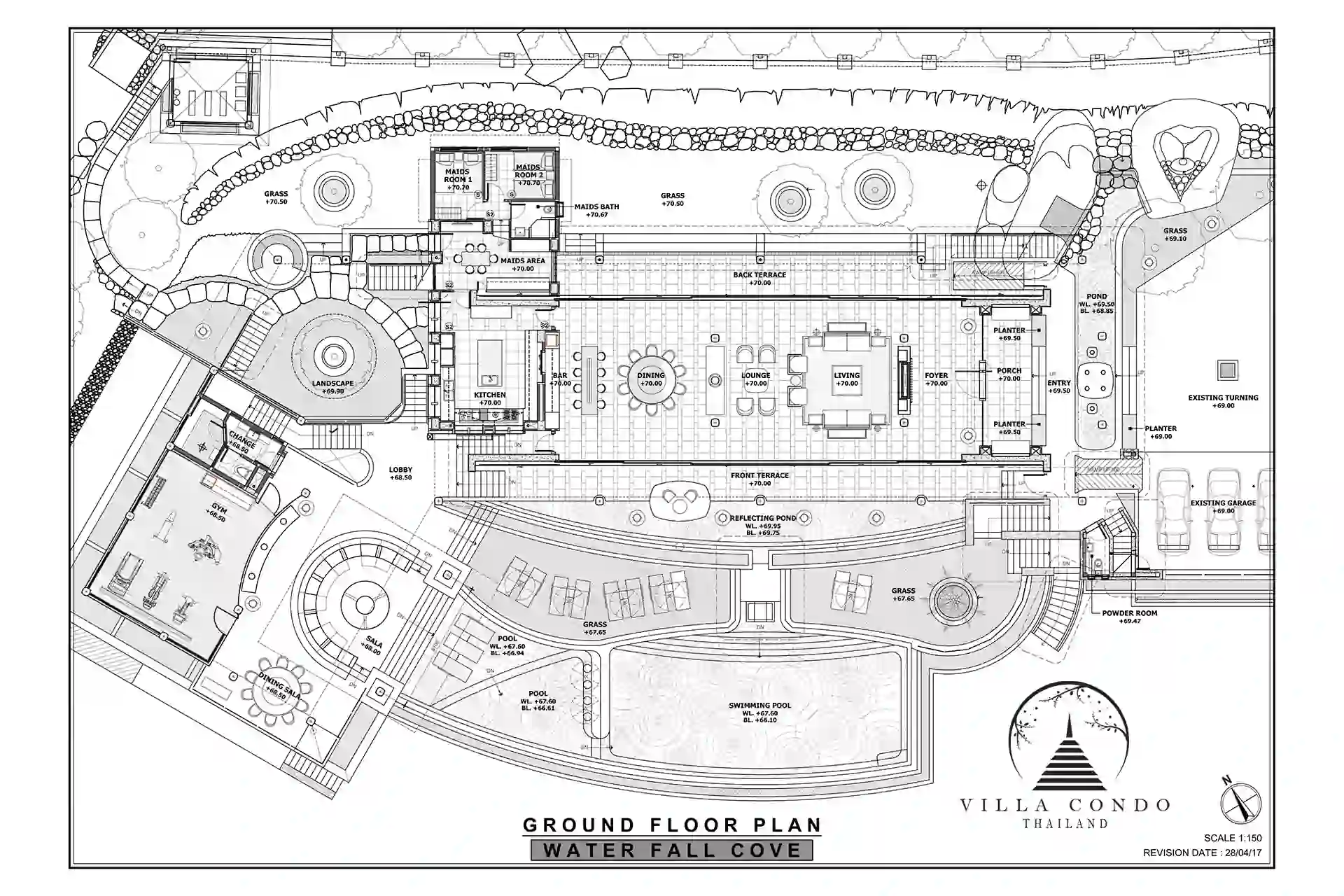 Spanning a vast sea-view land plot of 3,404 sqm, Villa Cascade Kamala Headland boasts a total covered area of 1,800 sqm, with an additional 700 sqm of uncovered space. The living, dining, and main kitchen areas extend the length of the main living space, featuring retractable, sliding floor-to-ceiling doors on both the seaside and the rear rock garden sides. This design allows for a natural ambiance to flow throughout the property. The villa derives its name from the year-round waterfall/cascade beside it, with a pathway leading down to the ocean cove, perfect for swimming, snorkeling, and diving.
