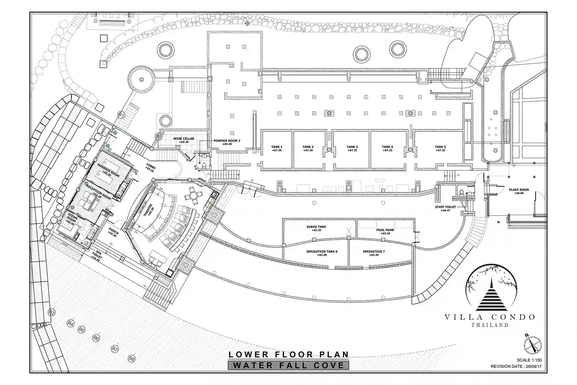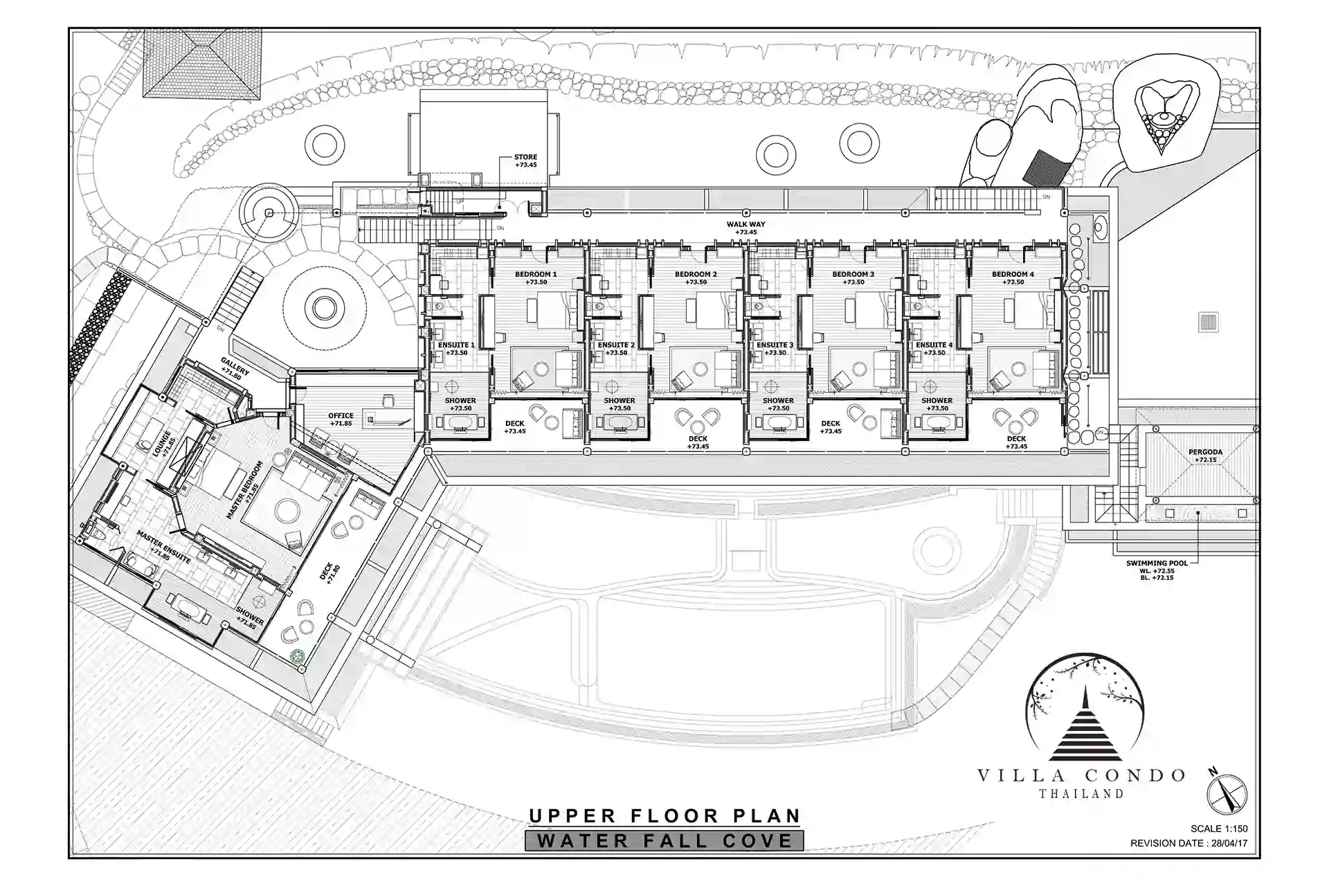 The villa features five sumptuous bedrooms, including a palatial master bedroom with an attached office. Each bedroom offers an intimate retreat with ensuite bathrooms, custom-made oversized bathtubs, and impeccable design. The highlight of the villa is the 25m x 8m jetted infinity pool with a swim-up bar and children’s area. The extensive outdoor terracing provides sweeping ocean views, while the terraced lawn area, positioned next to the cascading waterfall, creates an enchanting atmosphere of tranquility.